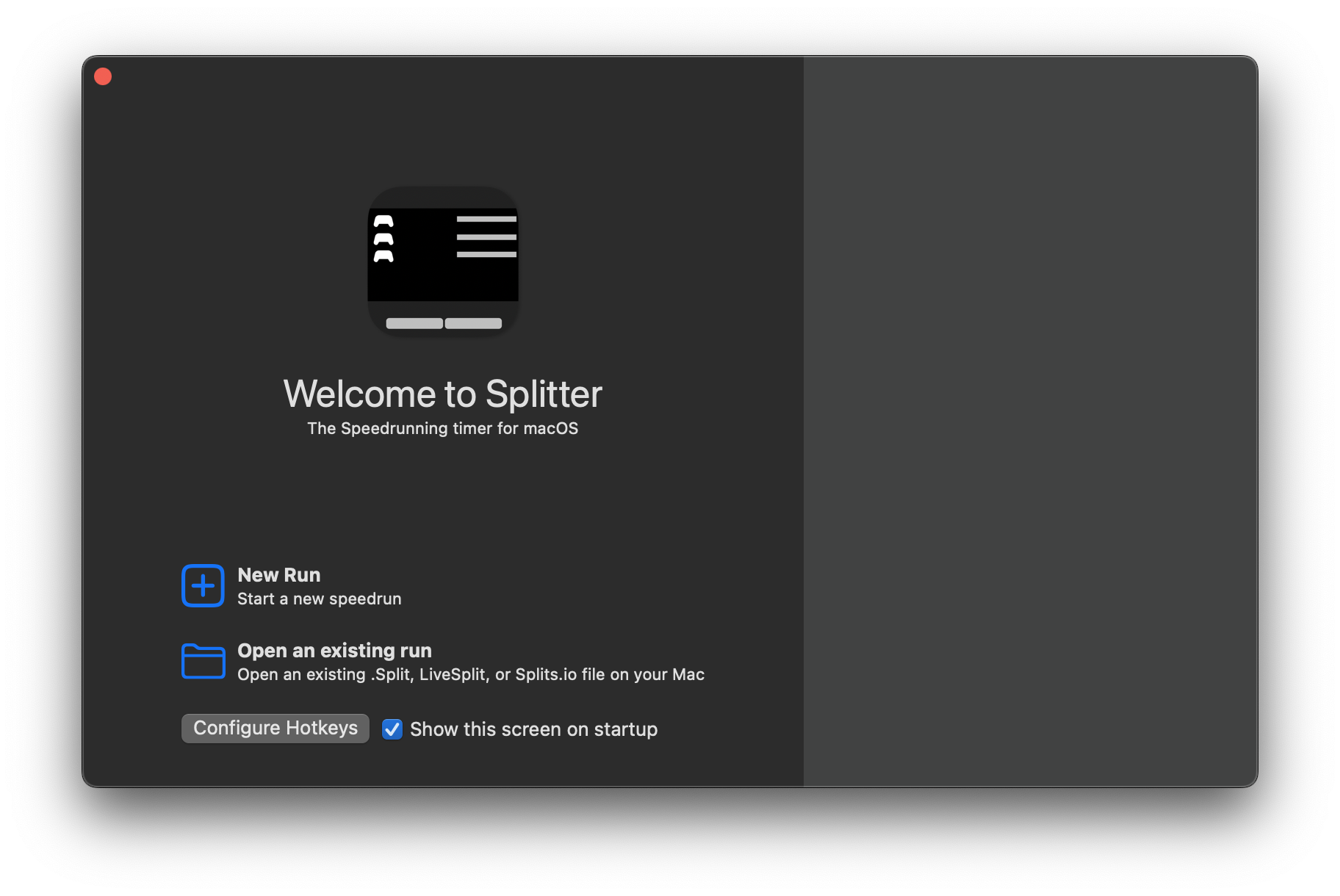 Splitter's welcome screen makes it easy to get started, even if you've never done a speedrun before.